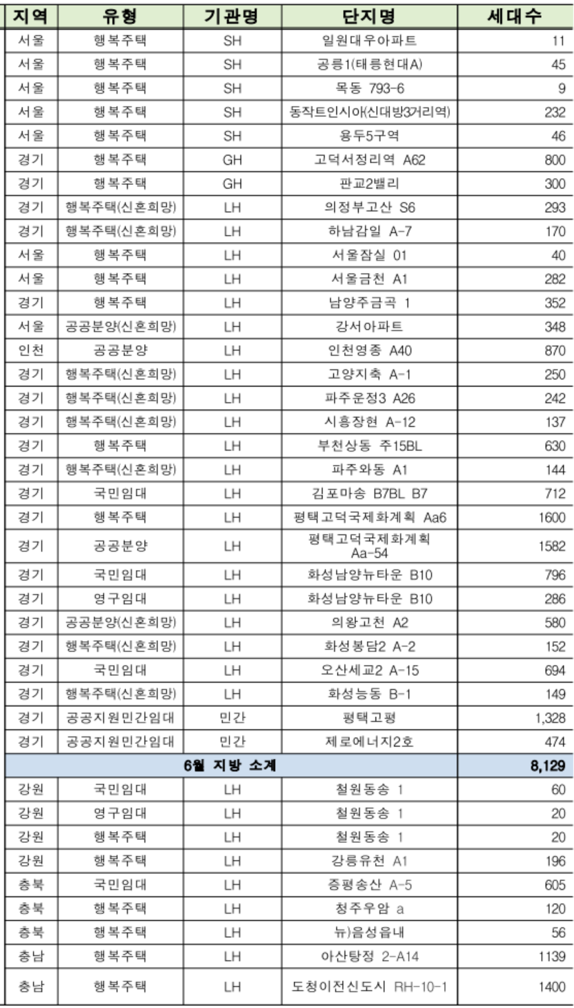 인천 검단과 파주 운정 및 아산 탕정과 양산 사송 등 지역에도 공공임대와 분양주택이 나옵니다. 경기와 인천에 56% 정도 집중되어 있다는 걸 알 수 있습니다. 공공분양이 알짜건만 48곳 32,959호만 나오는걸 보면 물량이 저조하네요.