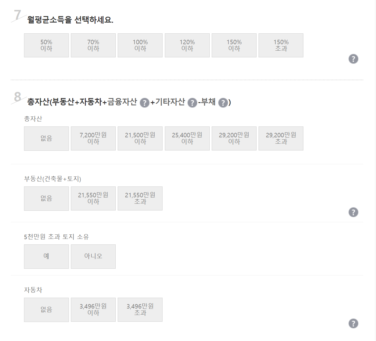 공공임대주택에서 살고 싶다면 월평균 소득의 70% 이하여야 하며 자산은 총 2억 4,400만원을 넘으면 안됩니다. 자동차는 2,524만원 이하인 분들만 됩니다. 자가진단을 시행중인 본인 뿐만 아니라 세대원 전원이 무주택을 전제로 합니다. 이걸 감안해서 월평균소득과 총자산 규모를 선택합니다.