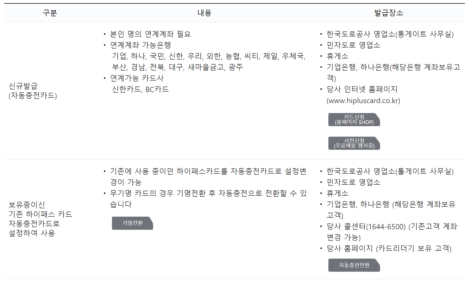 본인명의 연계할 계좌가 필요합니다. 우리나라 시중은행 13개사 어디든 상관없습니다. 1금융권 위주로 진행된다는 점만 참고하면 됩니다. 한국도로공사 영업소나 민자도로 혹은 휴게소 등에서도 발급받을 수 있고 하이플러스로 가서 받을 수도 있습니다.