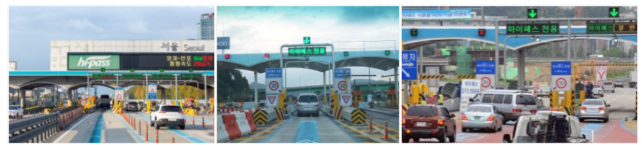 진한 파란색 바닥을 따라 1,2차선 또는 7,8차선 등으로 가면 하이패스 전용 통과구간 입니다. 이걸 그대로 빠져나가면 알아서 요금이 산정되서 매달 통장에서 돈이 빠져나가는 방식입니다. 굳이 신경쓰지 않아도 내 계좌에 잔고만 있다면 자동으로 처리됩니다.
