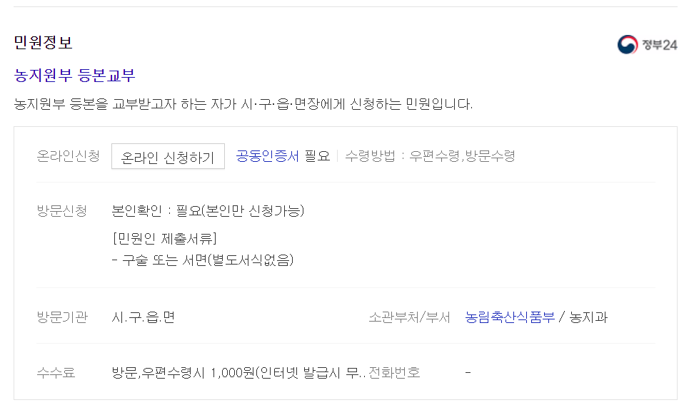주소지 관할 시, 구, 읍, 면, 동사무소 산업개발부서에 방문해서 신청하면 됩니다. 하지만 앞서 말씀드린 것처럼 아침 일찍부터 늦게까지 농사짓는 상황에서 쉽게 가기가 그렇죠. 이럴때는 오늘 알려드린 농지원부 인터넷발급 신청으로 시간과 노력을 모두 절약할 수 있습니다.