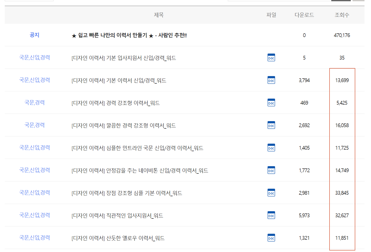 3. 이력서 양식 다운로드로 들어갑니다. 대기업,중소기업,중견기업 할 것 없이 왠만한 곳에서 가장 많이 사용되는 유형이니 안심하고 받으세요.
