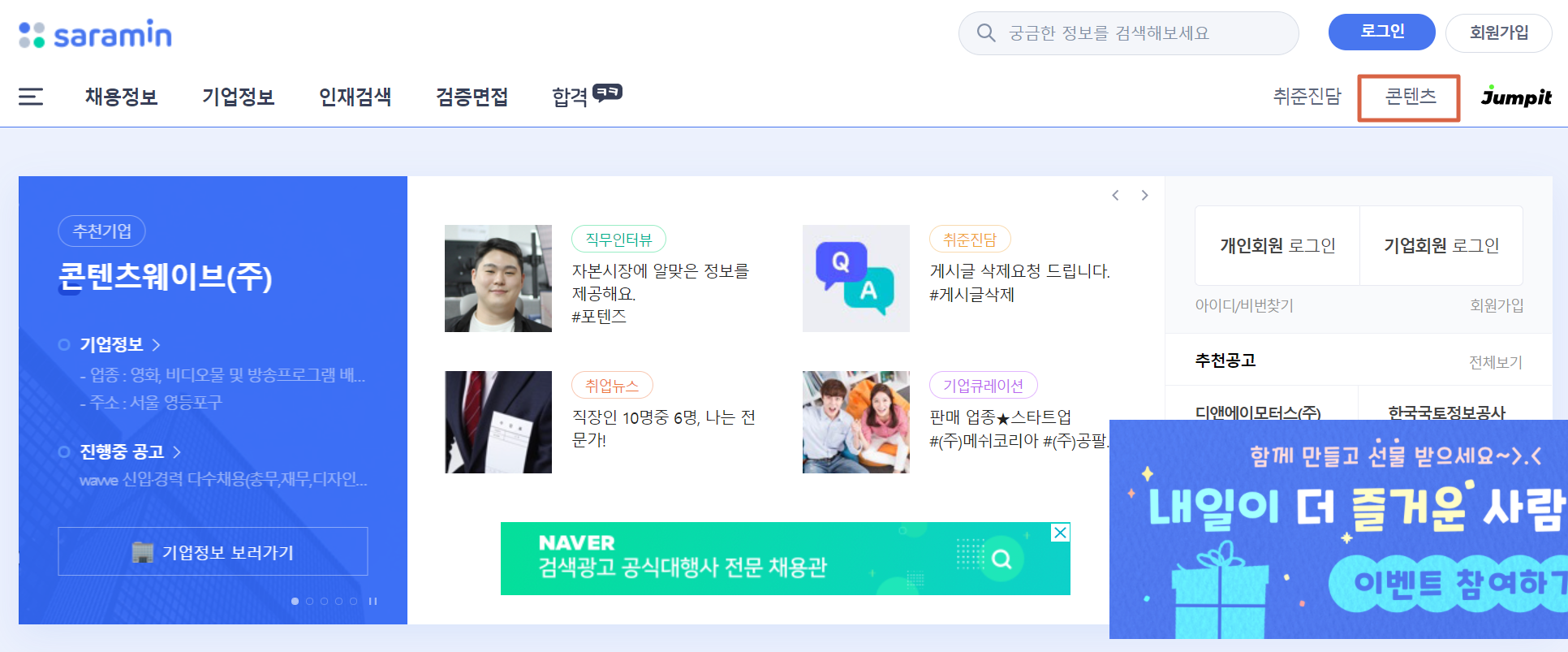 1. 안으로 들어온 직후라면 오른쪽 상단의 '콘텐츠'라는 항목을 눌러봅니다.