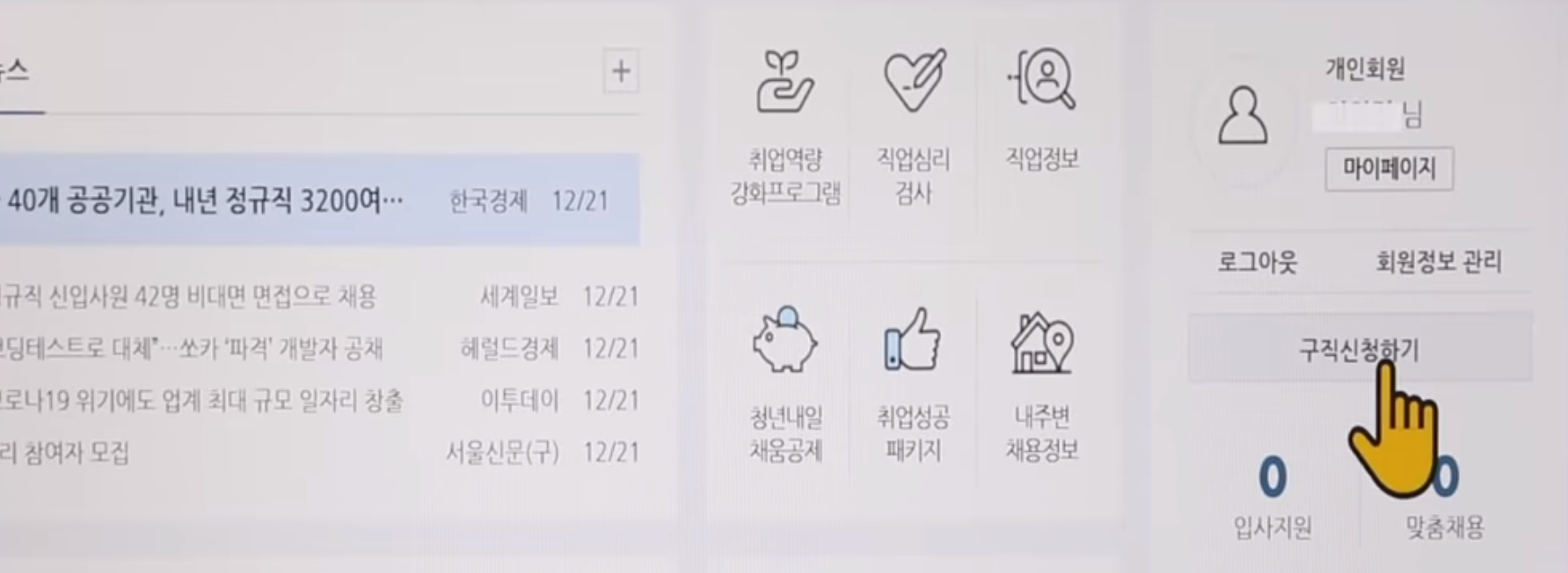 2. 가볍게 갑하고 로그아웃 아래를 보면 구직신청하기라고 있습니다. 이걸 손가락 이미지처럼 눌러봅니다.