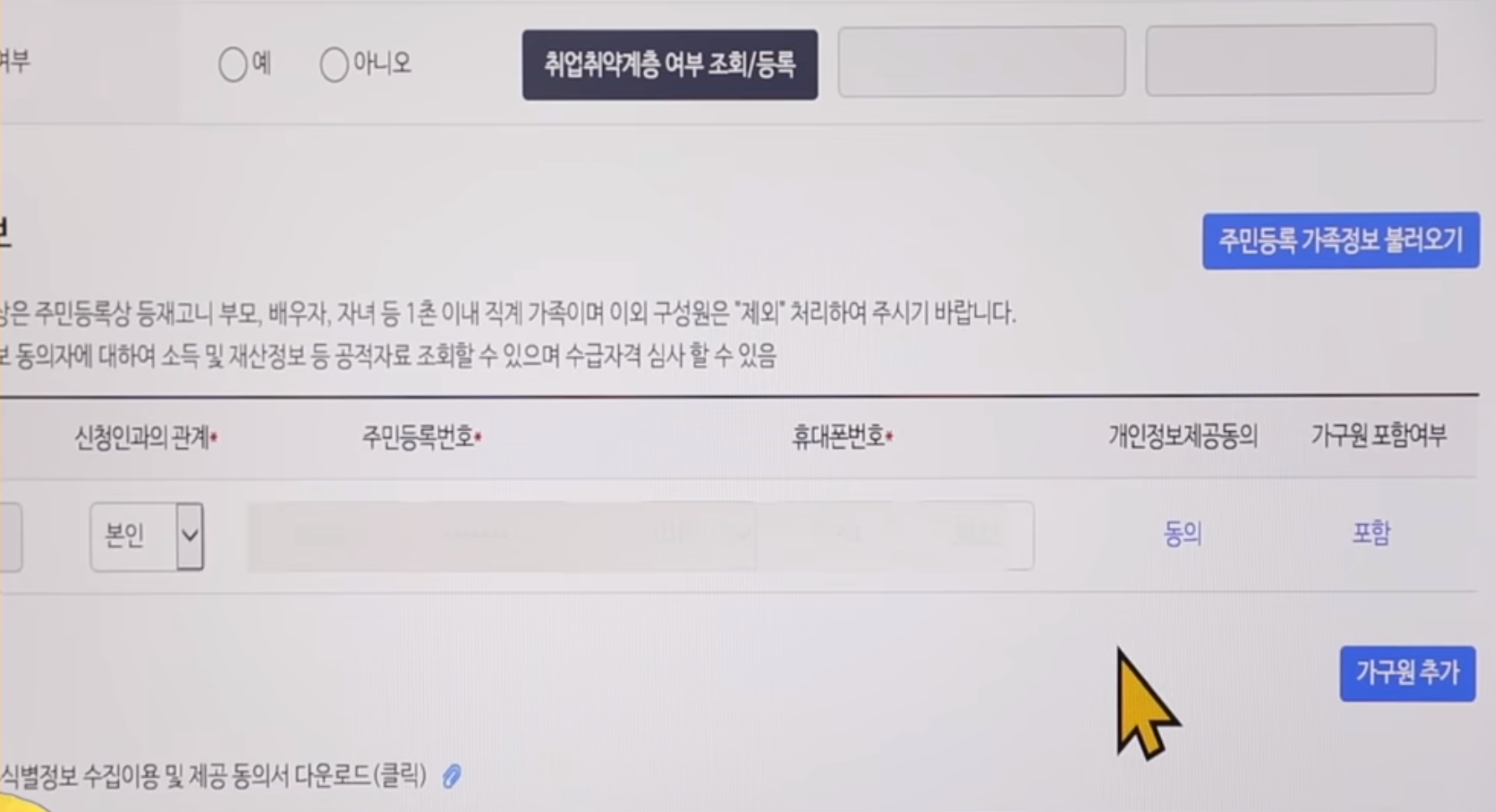 5. 취약계층 여부를 조회할 수도 있고 그에 따른 등록도 가능합니다. 가구원이 있다면 추가하는 방식으로 진행합니다.