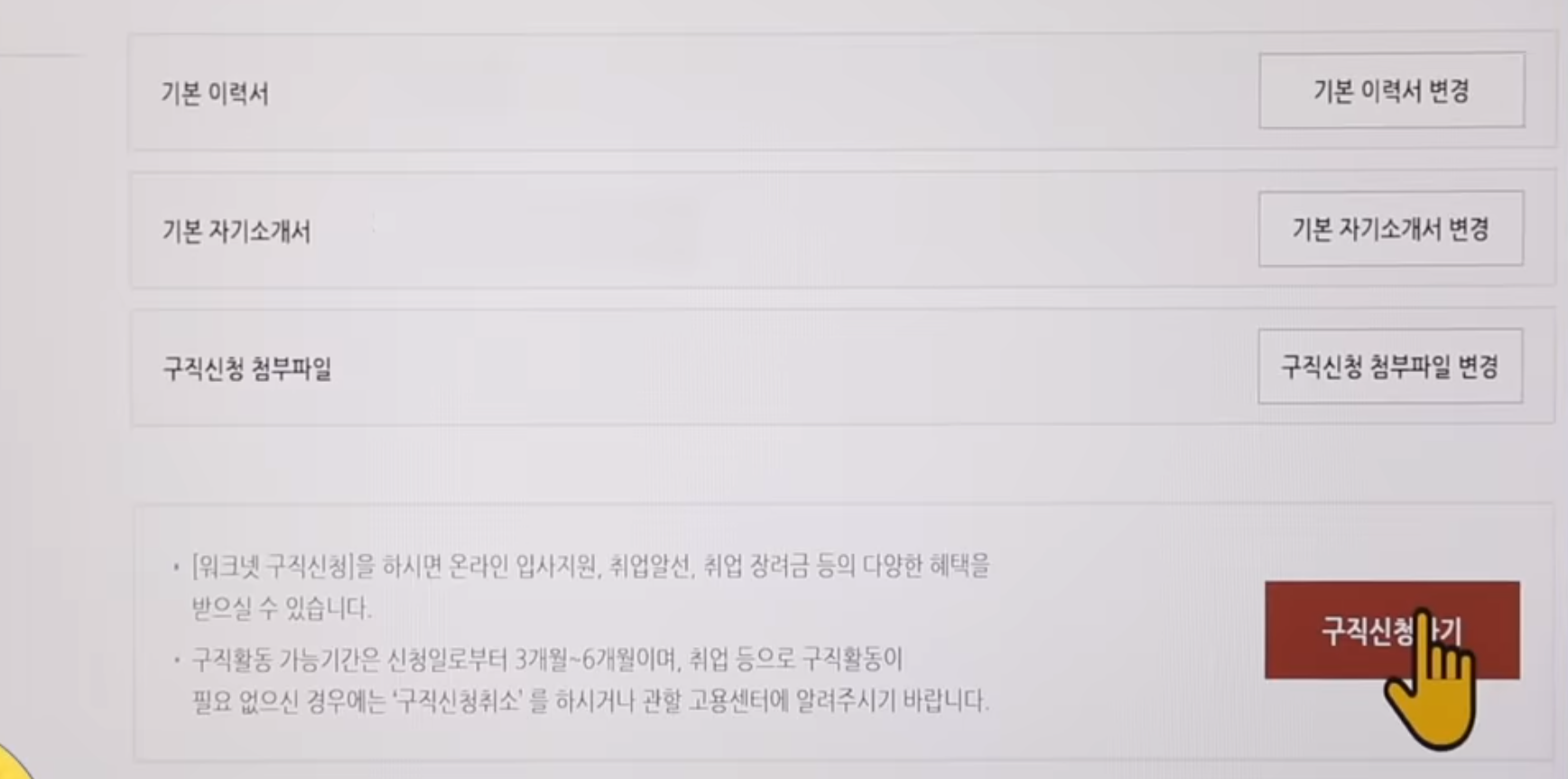 3. 기본이력서와 자기소개서 등을 올리고 이상이 없다면 구직신청을 합니다.