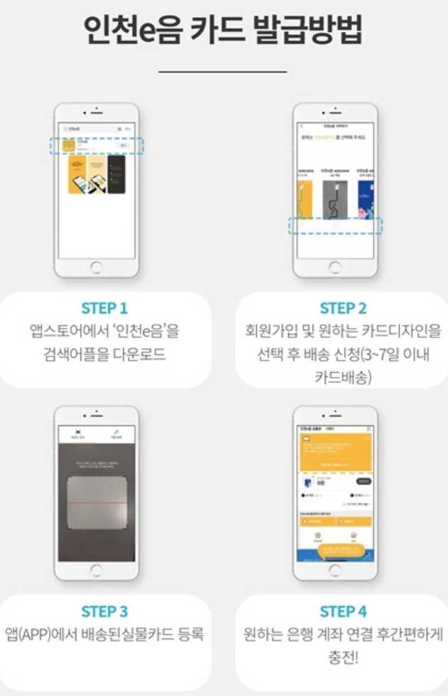 구글플레이스토어와 앱스토어로 들어가면 '인천e음'이라고 어플이 나옵니다. 회원 가입 및 희망하는 카드디자인을 선택하고 배송신청을 합니다. 배송된 시물카드를 앱상의 카메라로 찍어서 인식시켜야 합니다. 그다음은 원하는 은행 계좌로 연결 후 간편하게 충전해서 사용하면 됩니다.