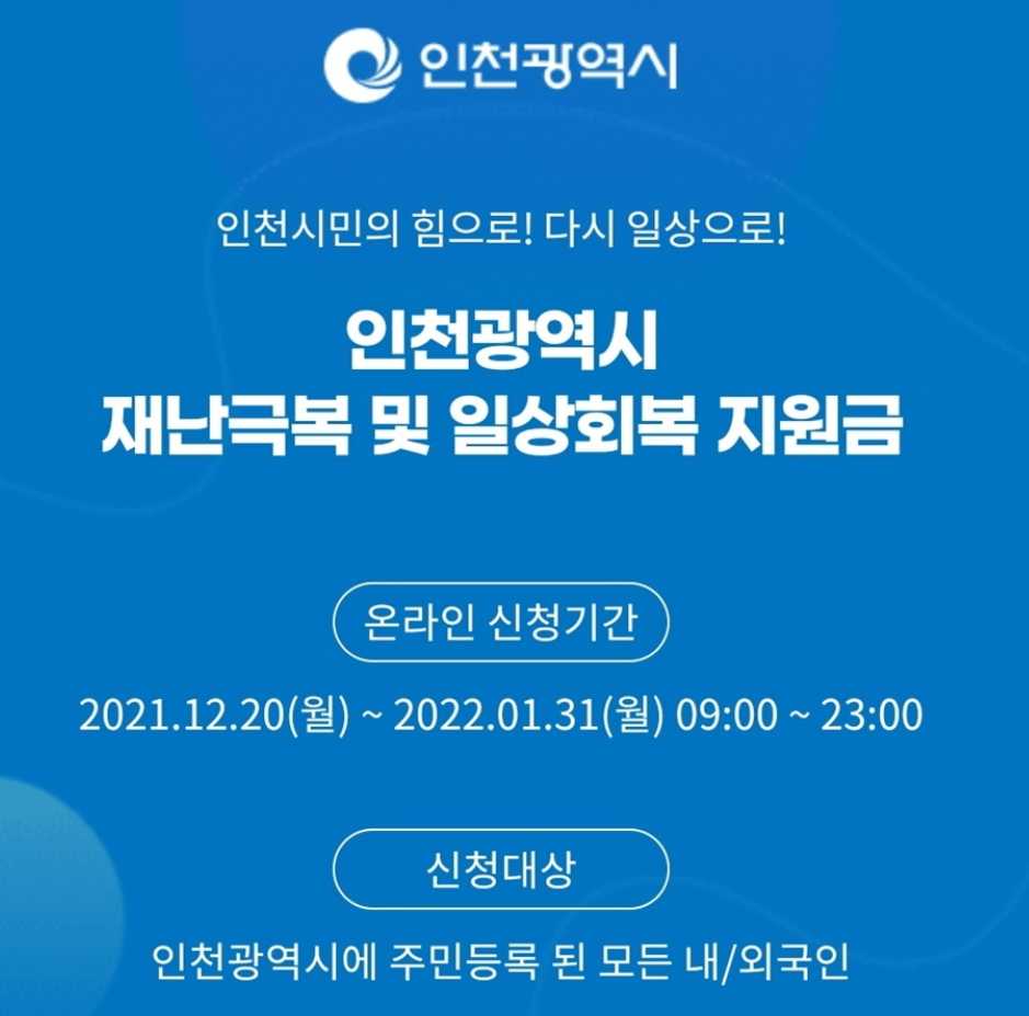 인천시민의 힘으로! 다시 일상으로! 인천광역시 재난극복 및 일상회복 지원금 온라인 신청기간 2021.12.20(월) ~ 2022.01.31(월) 09:00 ~ 23:00 신청대상 인천광역시에 주민등록 된 내국인 및 외국인 인천e