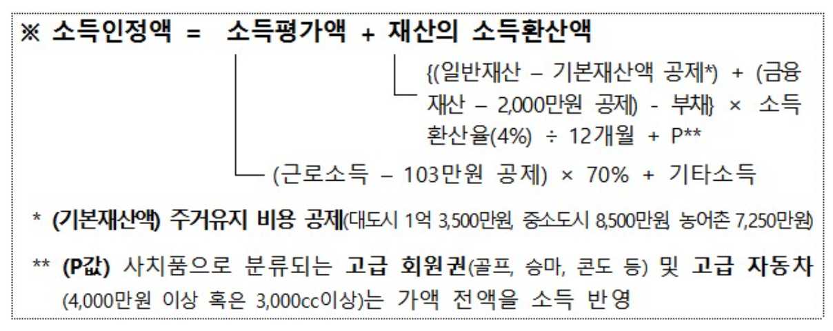 소득 평가액과 재산의 소득환산액을 더한 금액이 바로 소득인정액 입니다. 여기서 소득은 근로, 사업, 재산, 공적이전 소득 등을 총망라 하고 재산은 일반재산, 금융재산 등을 합산해서 반영하는 것입니다. 한마디로 내가 회사에서 일해서 벌어들인 소득도 포함되고 펀드나 주식 또는 부동산으로 갖고있는 재산 또한 환산해서 소득 기준치를 잡는 다는 말이죠.