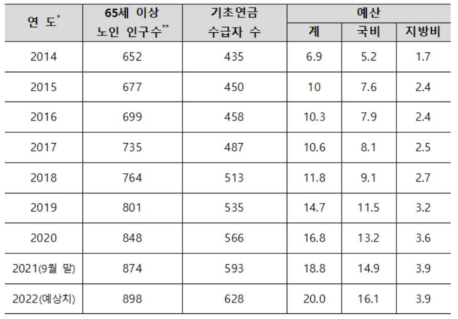 기초연금이 도입되던 시기는 2014년으로 거슬러 올라갑니다. 해당 시기의 수급자는 2023년 약 628만명으로 증가한 상태입니다. 전과 비교하면 기초연금 예산에 투입되는 비용도 20조원으로 2.9배 가량 증액된 상태입니다. 맨처음 도입되던 시기에는 기초연금 지급액이 20만원 제한이였던 것에 비해 21년에는 30만원까지 단계적으로 올랐습니다.