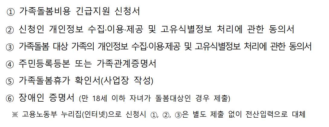 가족돌봄비용 긴급지원 신청서, 신청인 개인정보 수집이용제공 동의서, 가족돌봄 대상 가족의 개인정보 처리 동의서, 주민등록등본 또는 가족관계증명서, 가족돌봄휴가 확인서, 장애인 증명서 등이 필요합니다.