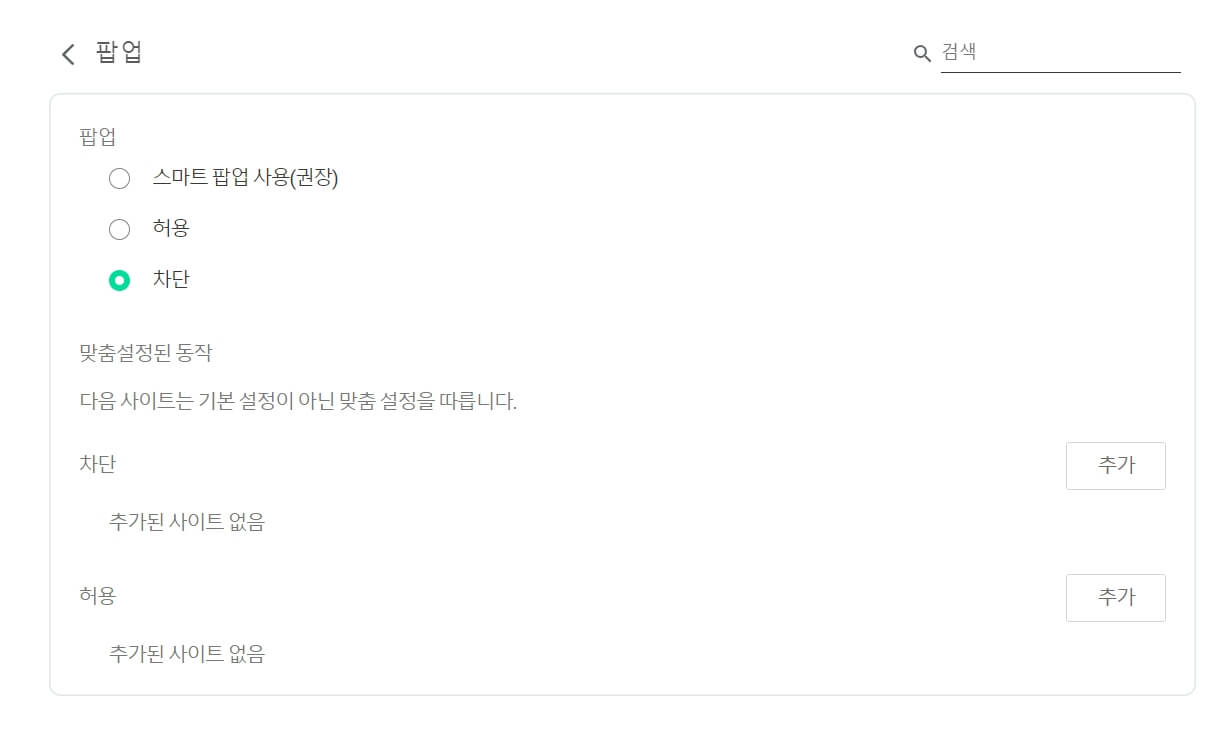 본문의 해결방법만 그대로 따라 하면 다시는 팝업 광고를 보지 않을 겁니다. 웨일에 기본으로 탑재된 팝업 차단 기능만으로는 gotosearchresultpage 광고를 막지 못합니다. 추가된 사이트 없음 옆에 있는 '추가' 버튼을 꼭 눌러서 해당 URL을 차단시켜야 합니다.