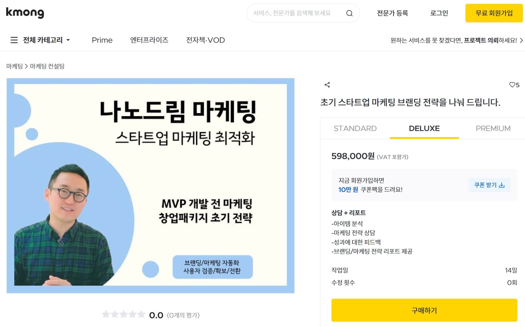 초기 스타트업 마케팅 브랜딩 전략을 나눠준다는 크몽 사이트가 왠 말인가요? 저는 관심도 없는 화면이 나타납니다.